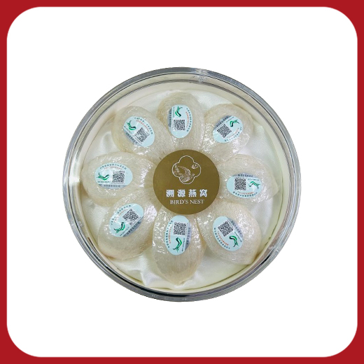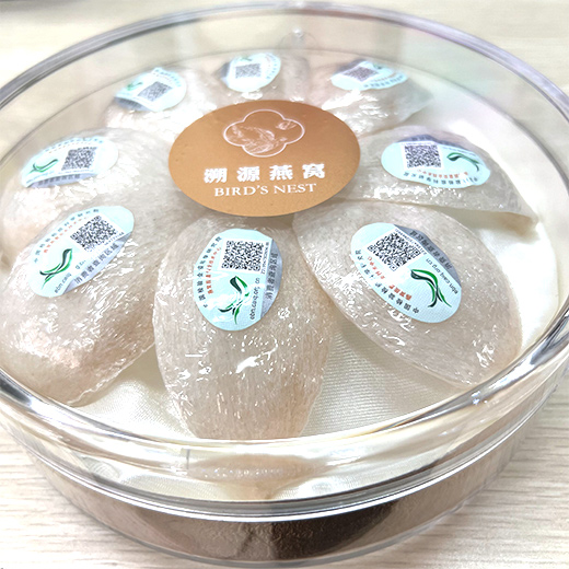 每盒60g,里面包含8-10盏燕窝,颜色米白,纹理清晰,足干通透。每一个燕窝都有一个追溯码,可扫码验证。