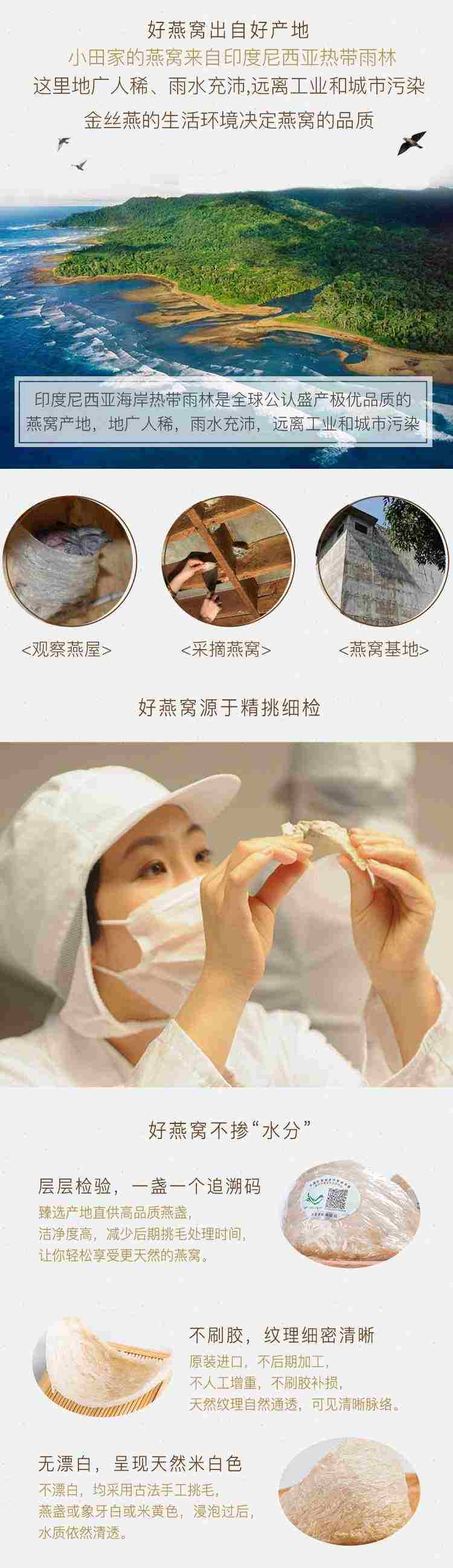 简介: 臻选产地直供,采用古法手工挑毛,洁净度高。炖燕窝大概需要30~40分钟,炖好后放入冰糖、蜂蜜、牛奶、水果等,味道香浓,口感良好。