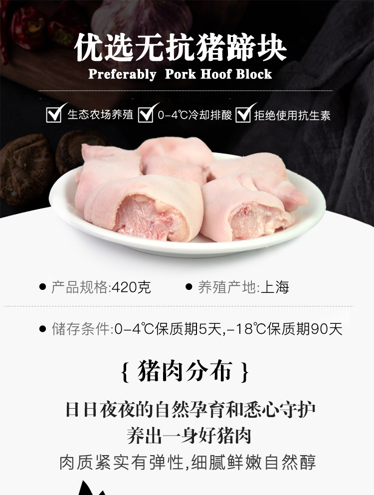 简介: 引进荷兰托佩克原种猪,生性活泼好动;生态养殖场养殖,选用符合国家标准的优质原料喂养,屠宰后0℃-4℃冷链排酸,适合红烧、煲汤、酱卤。注:猪脚尖部位和猪脚踝部位混装,介意慎点。