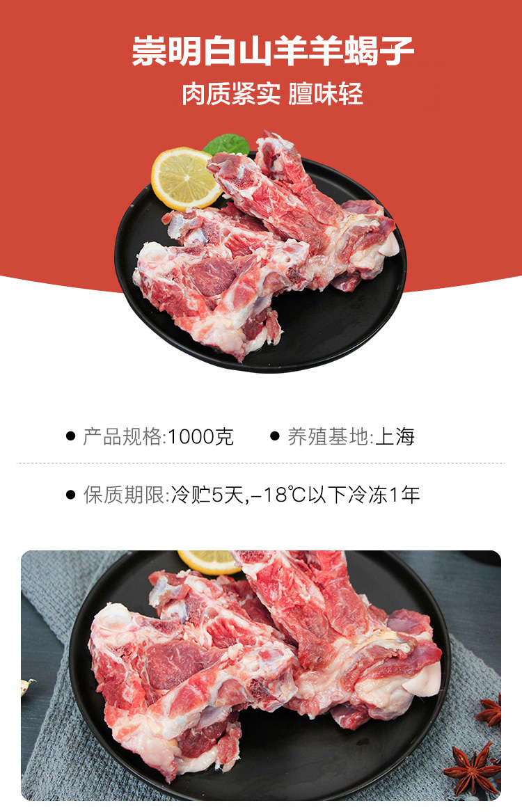 周三截单,周五配送。崇明味道,肉质鲜嫩,味道鲜美,晚上吃羊蝎子火锅吧~