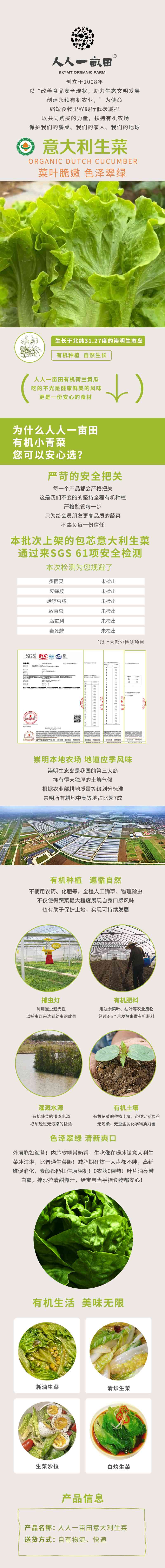 简介: 来自人人一亩田崇明农庄,种植过程严格监测,冷链运输,快捷保鲜。 意大利生菜属于半包心生菜,叶片厚于其它生菜,可生食、拌食或作配菜。