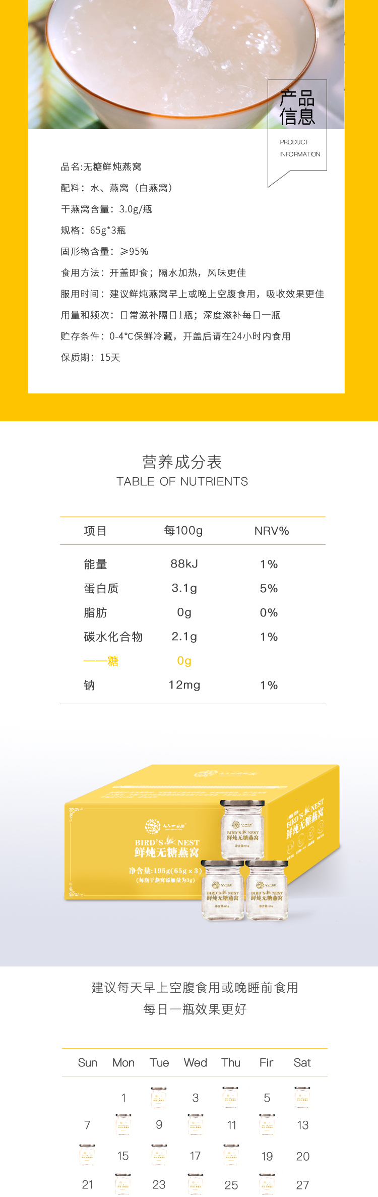 简介: 源自印尼自建燕窝工厂,从源头把关每一盏燕窝的品质,只选用燕窝的盏身部分,固体物含量≥95%,1500次纯手工挑毛,低温真空杀菌,无菌95℃炖煮,只为生产优质鲜炖燕窝,适合大众人群的健康需求。