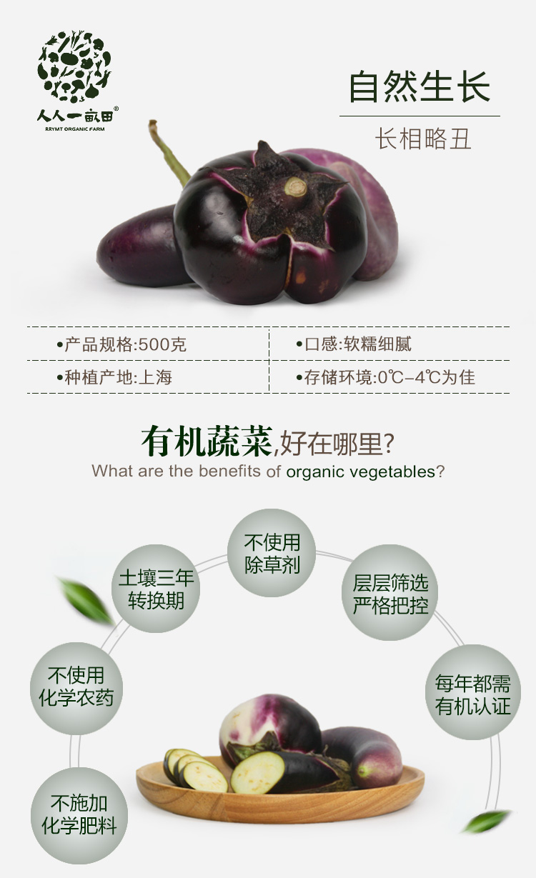 简介: 人人一亩田有机农庄多年来一直努力最大程度上杜绝农药、化肥、转基因种子、除草剂,种植蔬菜的过程更加符合环境保护,更多避免化学伤害。茄子原产亚洲热带,是夏季主要蔬菜之一,其食法多样,可腌制、煮、烧、蒸和焖等。