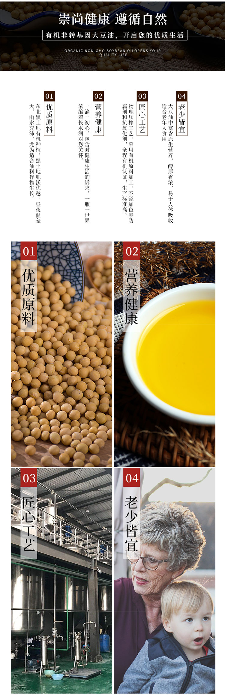 简介: 东北黑土地有机种植,传统压榨工艺,有机原料加工,无色素无添加剂,适合人体吸收,营养均衡,老少皆宜。