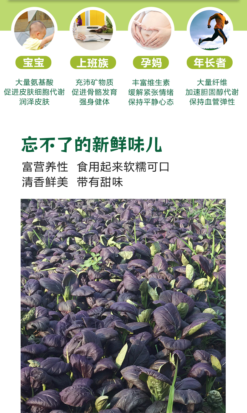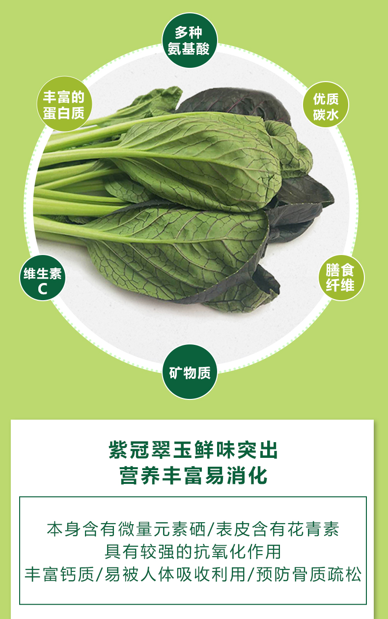 简介: 来自人人一亩田崇明农庄,专注种植,严格监测,冷链运输,快捷保鲜。 是披着紫色外衣的小白菜,可炒菜、煲汤等。