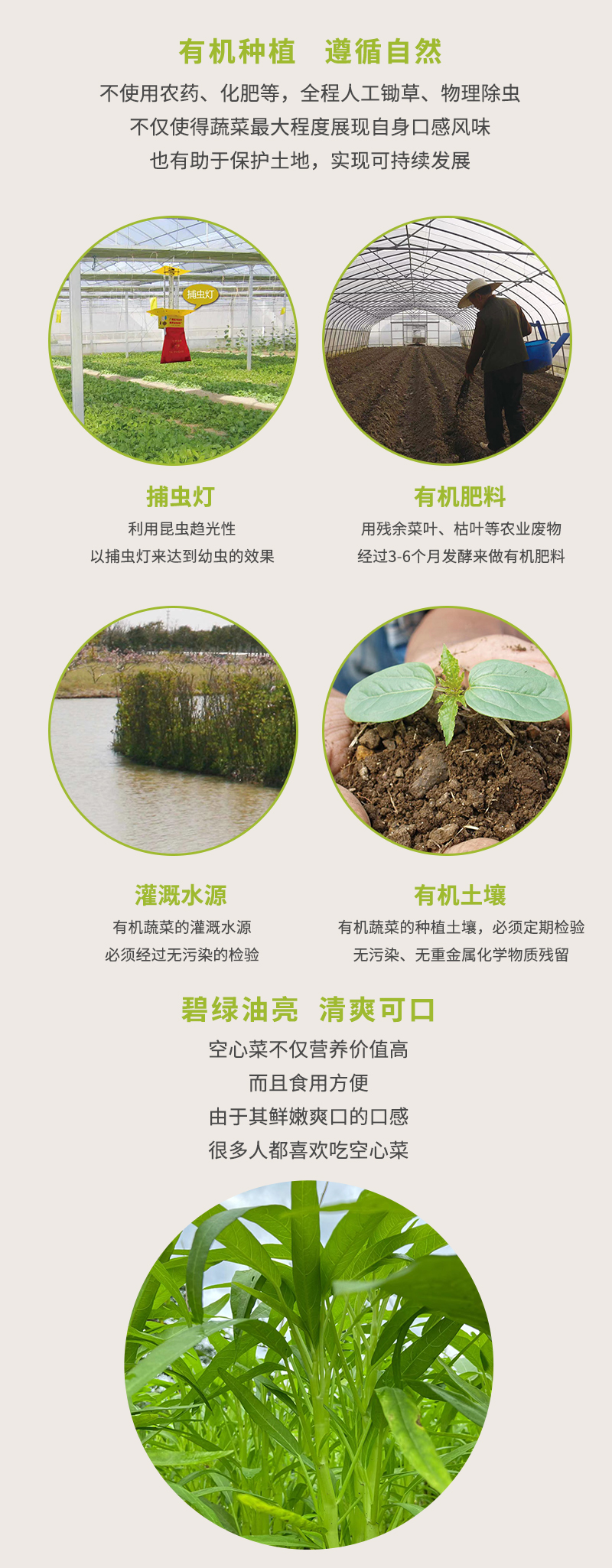 简介: 来自人人一亩田崇明农庄,专注种植,严格监测,冷链运输,快捷保鲜。富含维生素、膳食纤维等,营养丰富,可消暑降温、润肠等。可用来炒食、凉拌等。