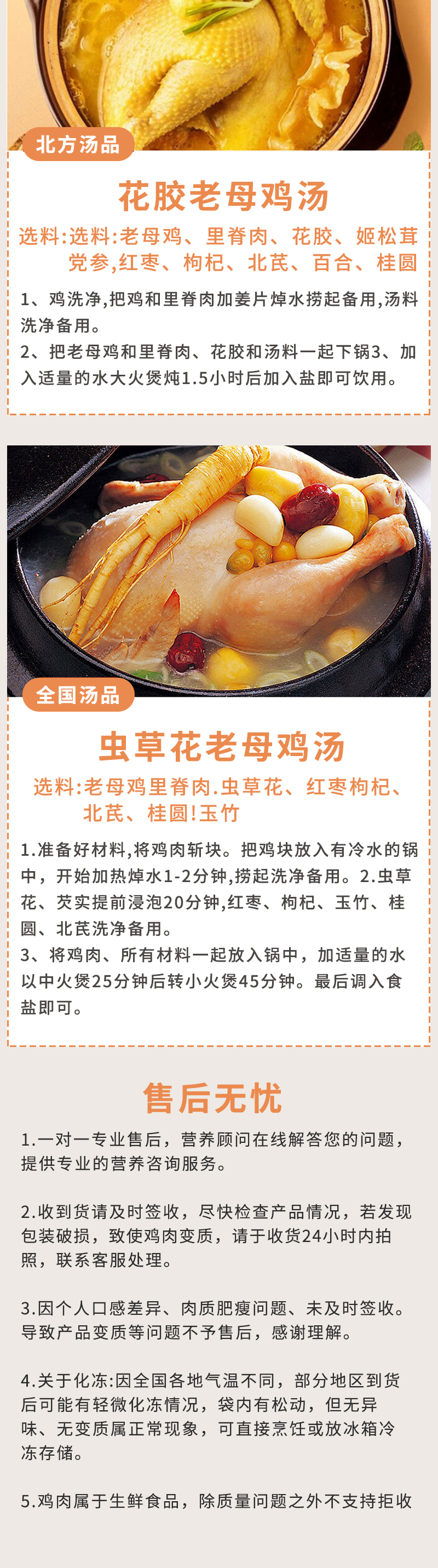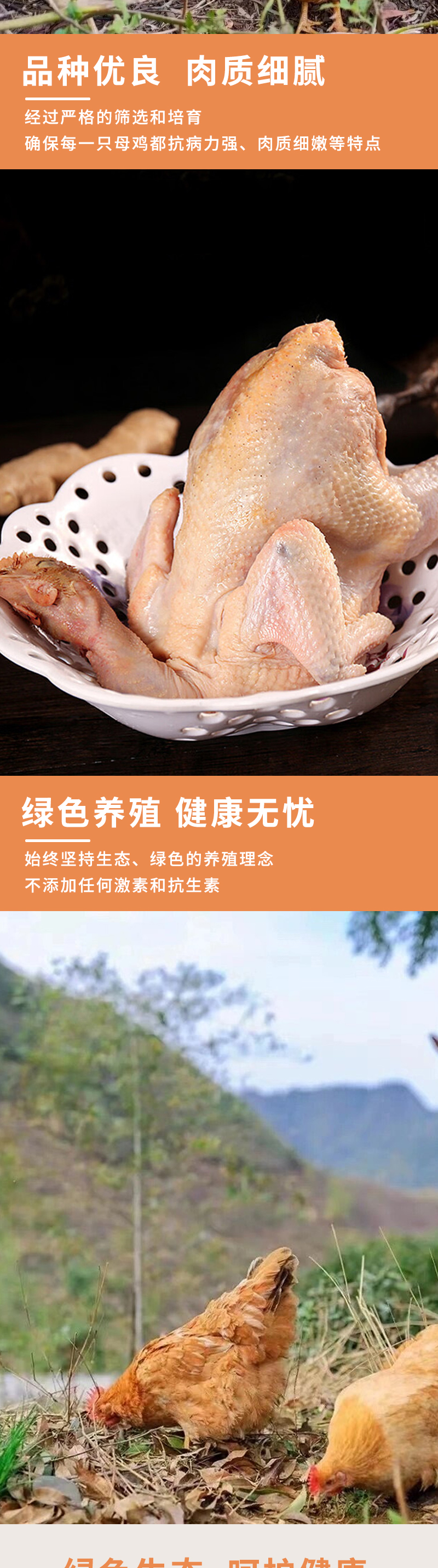 自由散养,肉质紧实,醇香鲜嫩,老母鸡多为黄雌鸡肉,味甘、无毒,热性相对公鸡肉较低,具有添髓补精、助阳益气的功效,可防治遗精早泄、小便频数、肠癖泻痢、脾虚滑痢、水癖水肿