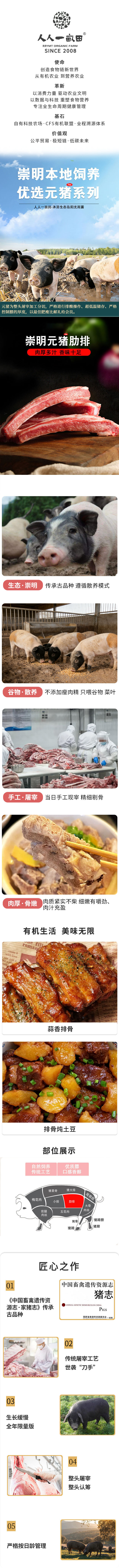 简介: 人人一亩田优选元猪系列,崇明本地饲养。由崇明最老“资格”生猪加工厂操作,分切称量严格控制,高标准好品质。