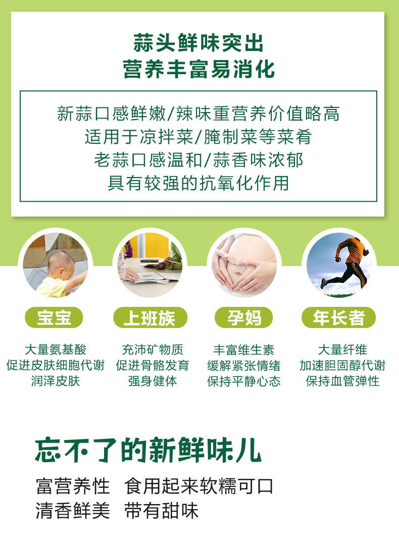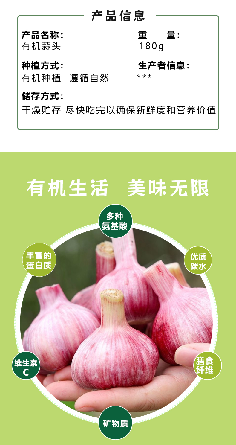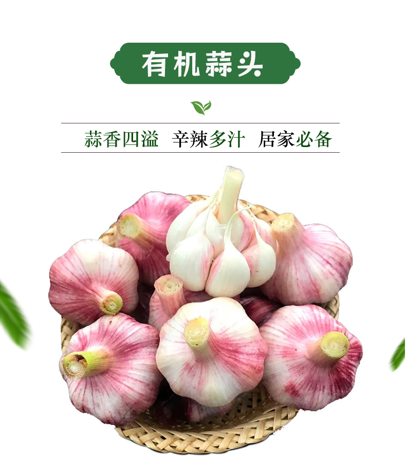 简介: 专注品质,匠心种植,产地现摘,新鲜到家。大蒜具有强大的杀菌能力,能消灭侵入体内的病菌。它还有助维生素B1的吸收,促进糖类的新陈代谢以产生能量。
