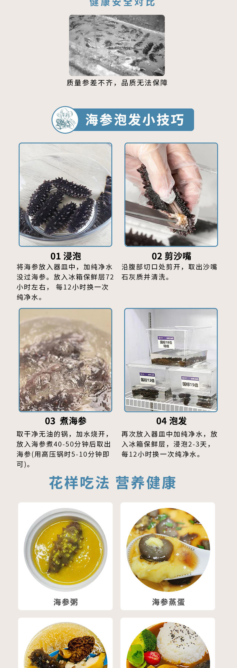 简介: 臻选产地直供,历时约30天,模拟海风自然风干,冷水浸泡12-17小时就能回软,30-60分钟煮透,泡发即食,也可熬汤,海参捞饭等。