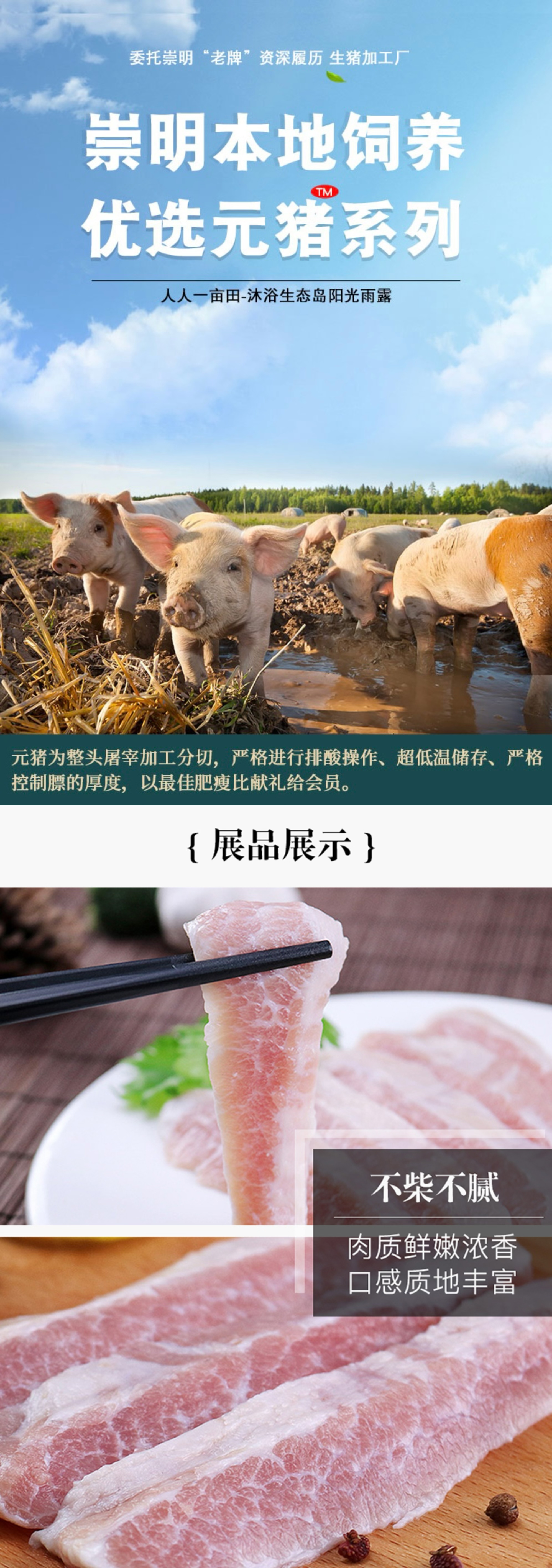 简介: 人人一亩田优选元猪系列,崇明本地饲养。由崇明最老“资格”生猪加工厂操作,分切称量严格控制,高标准好品质。