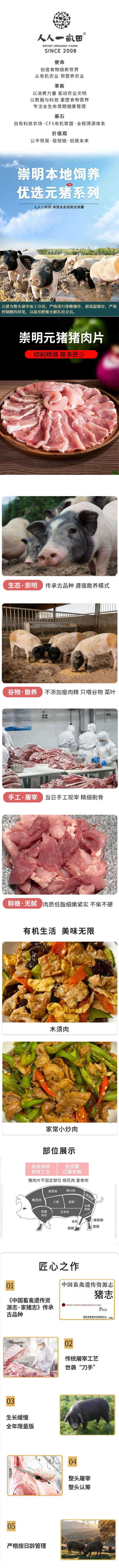 简介: 人人一亩田优选元猪系列,崇明本地饲养。由崇明最老“资格”生猪加工厂操作,分切称量严格控制,高标准好品质。