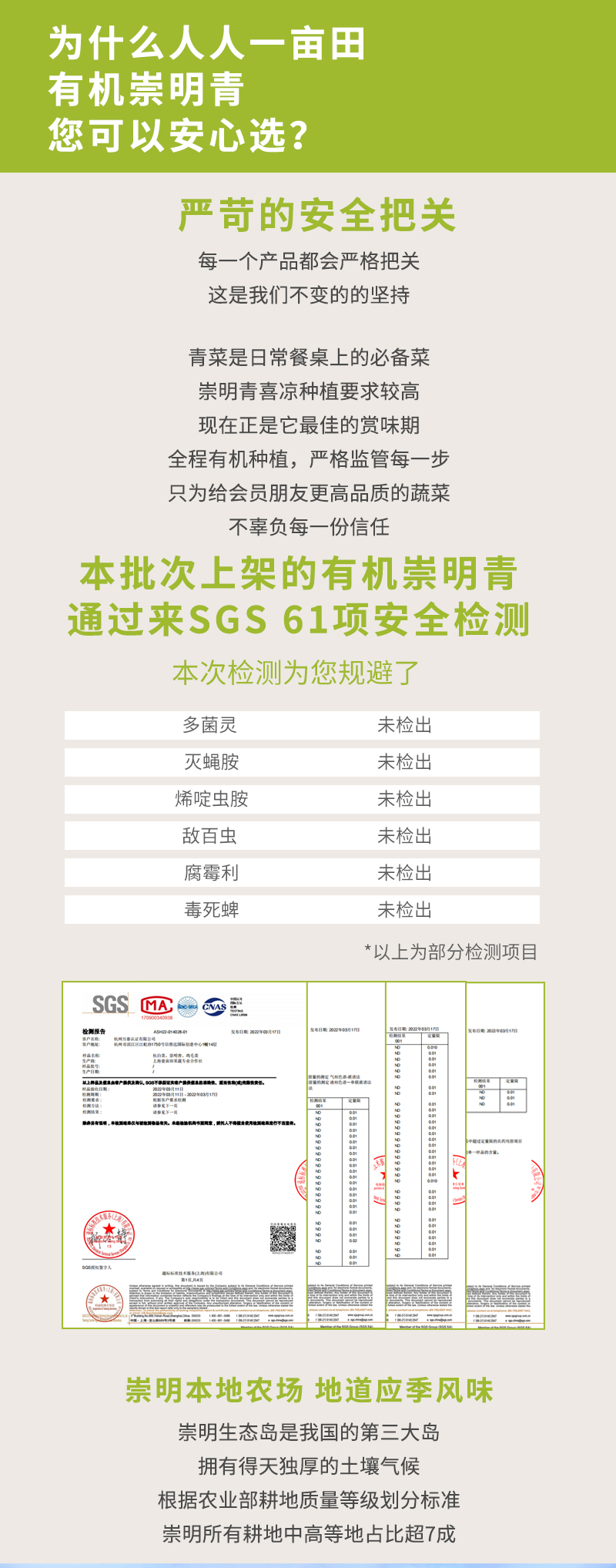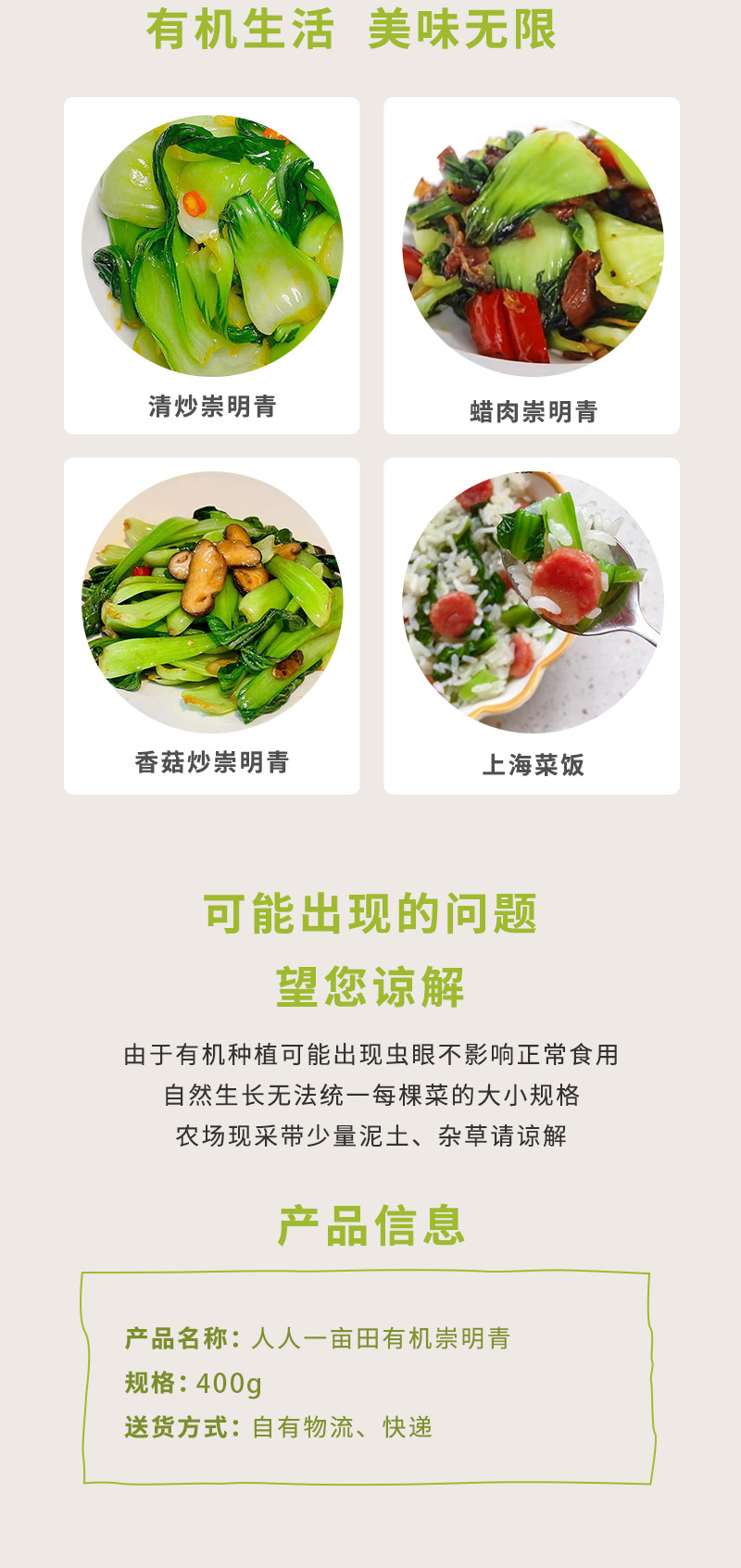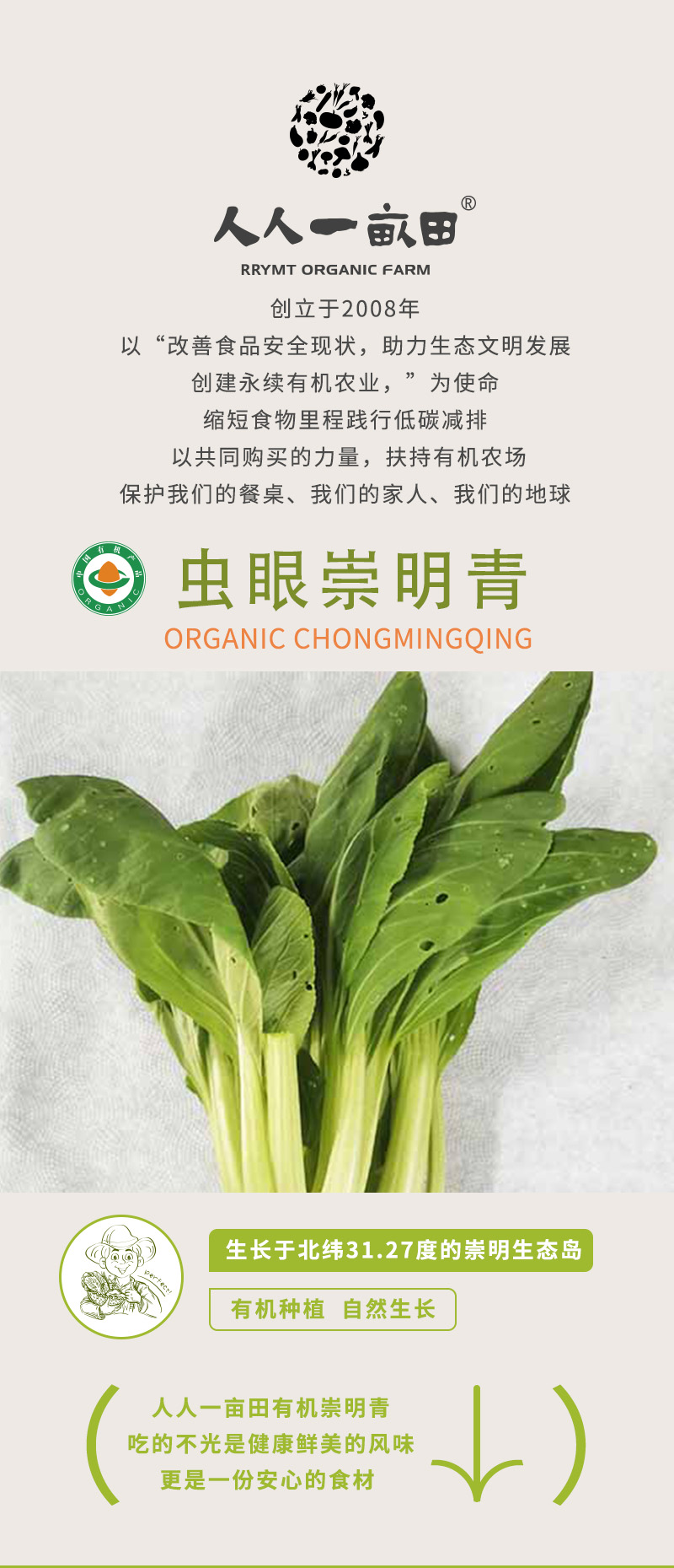 简介: 高温天气,有机种植不易,虫洞较多,介意勿拍来自人人一亩田崇明农庄,专注种植,严格监测,冷链运输,快捷保鲜。
