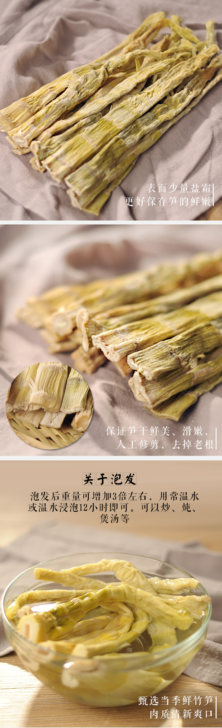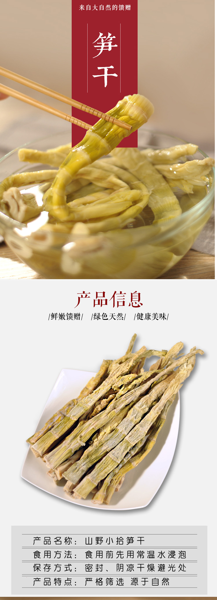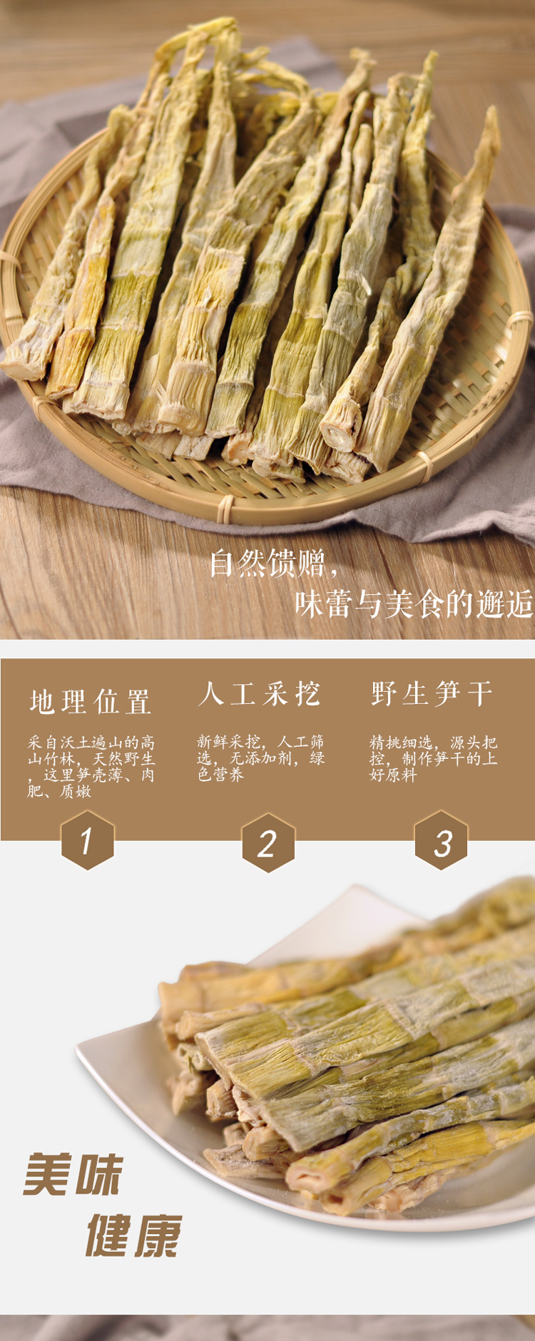 简介: 干制,含有盐份,介意勿拍甄选原料,匠心制作,真空包装,冷链运输。甄选当季鲜笋为原料,回味无穷!