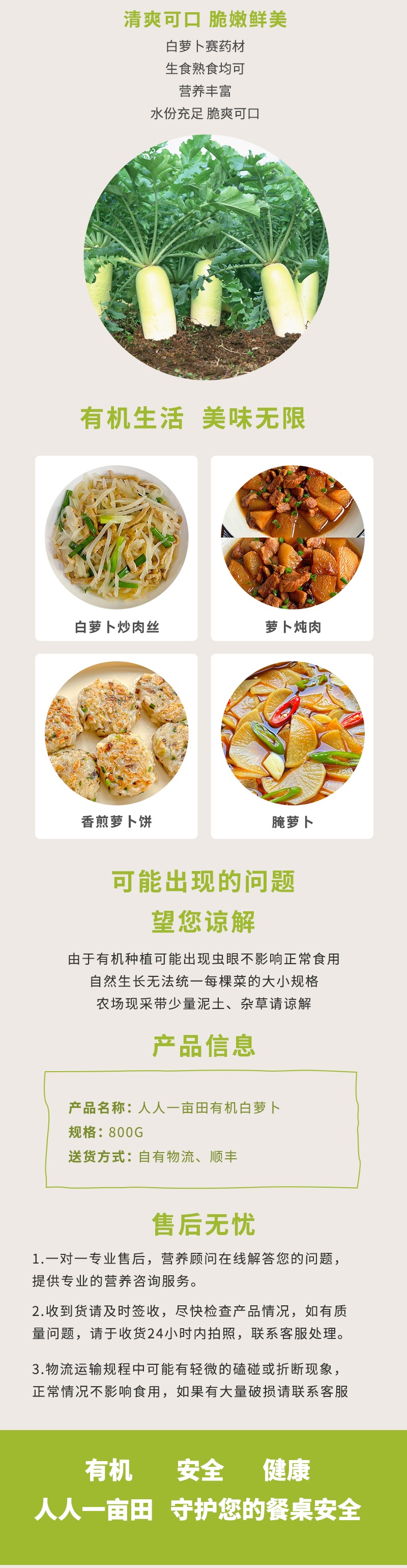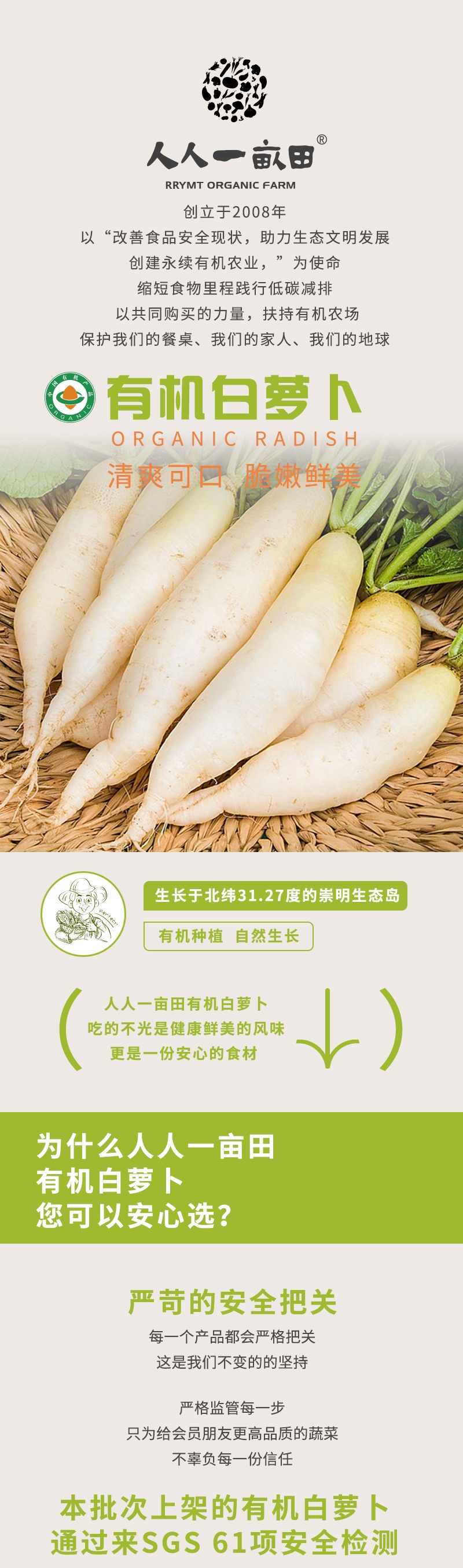 简介: 来自人人一亩田崇明农庄,专注种植,严格监测,冷链运输,快捷保鲜。白萝卜别称“芦菔”,可炒、凉拌、炖汤、腌制等。