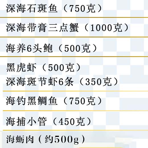 发,现捕现捞现订单确认后,预计3个工作日到达。(江浙沪包邮,其他地区快递费用另算。)内含:深海石斑鱼(约750克),深海带膏三点蟹(约1000克),海养6头鲍(约500克),黑虎虾(约500克),深海斑节虾6条(约350克),海钓黑鲷鱼(约750克),海捕小管(约450克),现剥海蛎肉(约500g)。