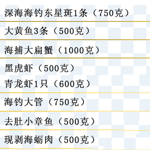 现捕现捞现发,订单确认后,预计3个工作日到达。(江浙沪包邮,其他地区快递费用另算。)内含:深海海钓东星斑1条(约750克),大黄鱼3条(约500克),海捕大扁蟹(约1000克),黑虎虾(约500克),青龙虾1只(约600克),海钓大管(约750克),去肚小章鱼(约500克)现剥海蛎肉(约500克)。