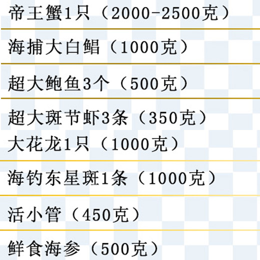 简介: 内含:帝王蟹1只(约2000-2500克),海捕大白鲳(约1000克),超大鲍鱼3个(约500克),超大斑节虾3条(约350克),大花龙1只(约1000克),海钓东星斑1条(约1000克),活小管(约450克),鲜食海参(约500克)。现捕现捞现发,订单确认后,预计3个工作日到达。(江浙沪包邮,其他地区快递费用另算。)