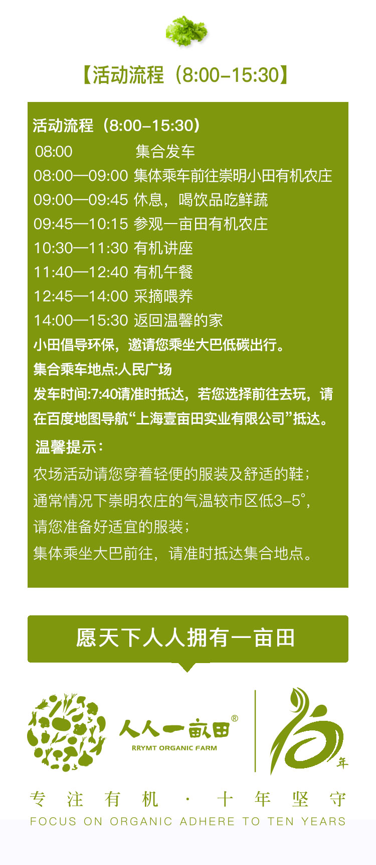 简介: 欢迎您来到人人一亩田崇明农庄,体验一天丰富、有趣的农夫生活,我们准备了好吃、好玩的各种活动