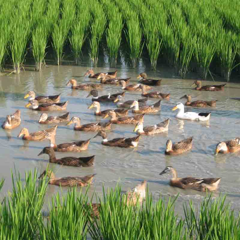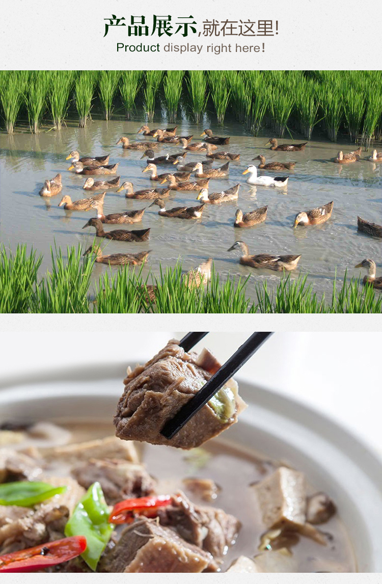 稻田鸭!采用稻鸭共育,在稻田里放入幼鸭,利用其除草、吃虫、松土、沃田,使得鸭子肉质紧致鲜美,适合煲汤哦。