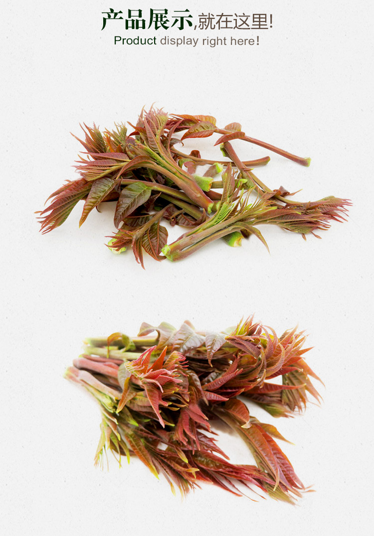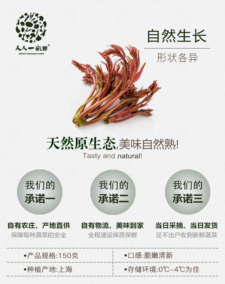简介: 来自人人一亩田崇明基地,专注种植,严格监测,冷链运输,快捷保鲜。香椿被称为“树上蔬菜”,是香椿树上的嫩芽。香椿发的嫩芽可做各种佳肴。它不仅营养丰富,且具有较高的药用价值。香椿叶厚芽嫩,绿叶红边,营养之丰富高于其他蔬菜,为宴宾之名贵佳肴。