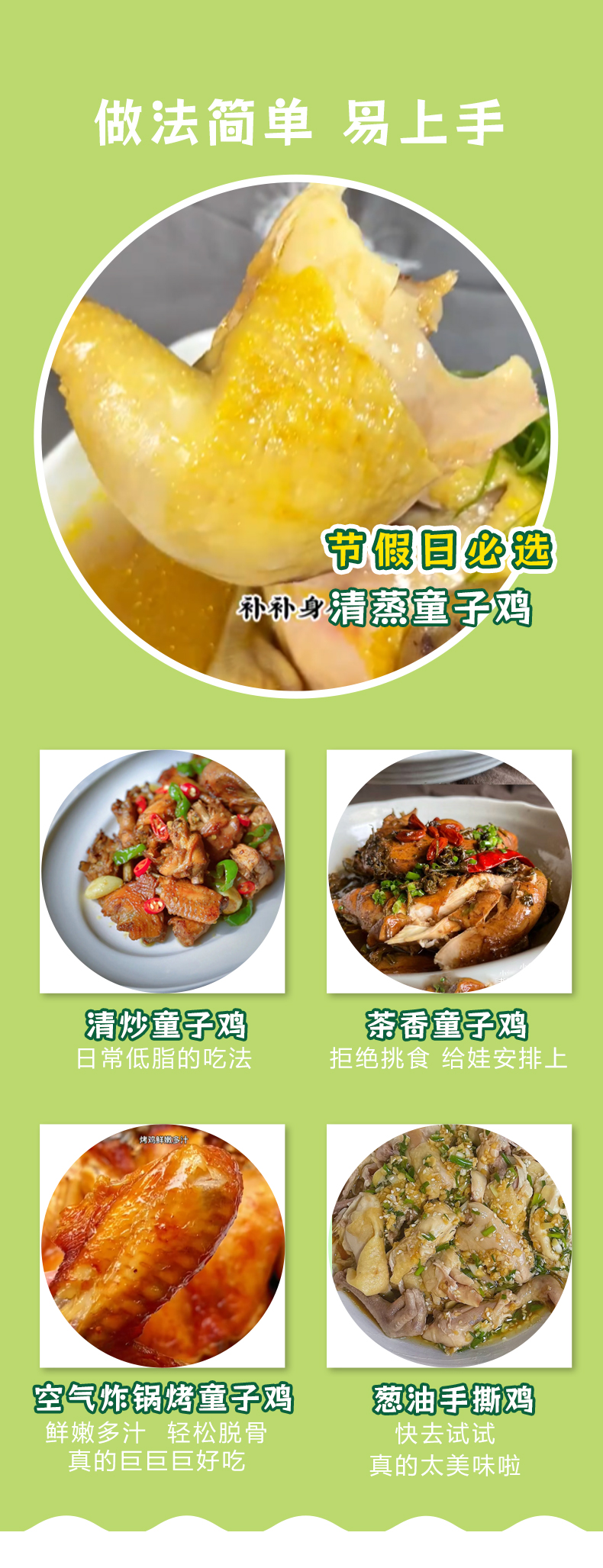 林地散养的童子鸡在林地长大,肉质紧致细腻,口味鲜美醇香,含有蛋白质、脂肪、钙、磷、铁、镁、钾、钠、维生素 A、B1、B2、C、E 和烟酸。TiGao免疫力力、健脾精,温中益气、益精填髓、益五脏、补虚、活血化瘀、补充营养、养颜护发