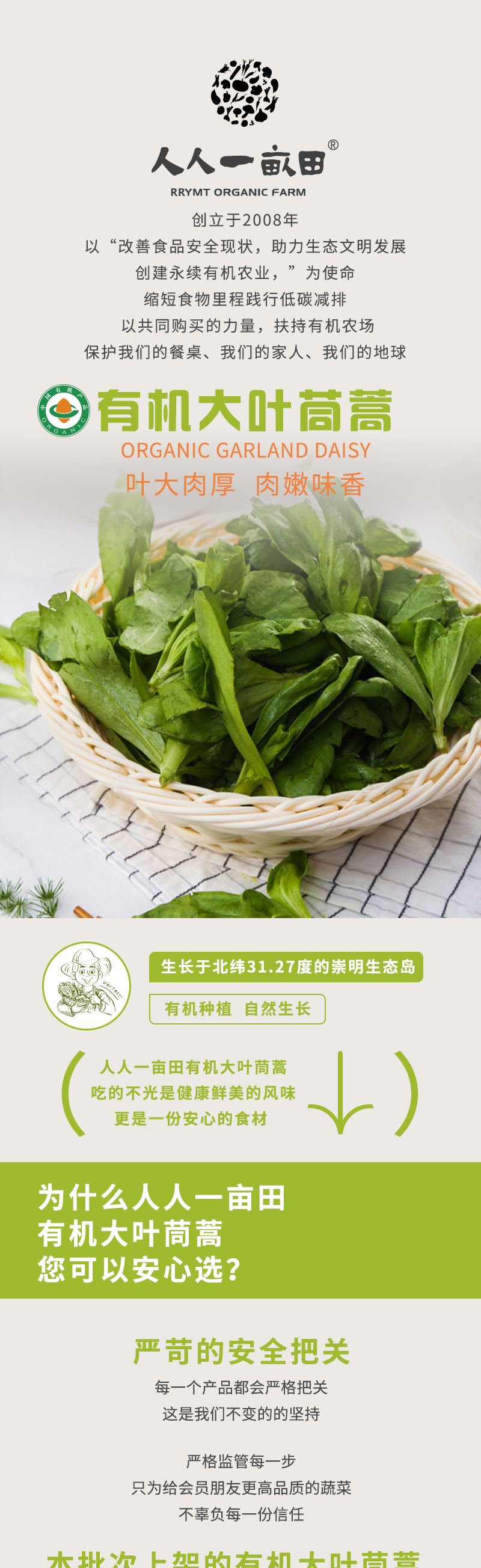 简介: 来自人人一亩田崇明农庄,专注种植,严格监测,冷链运输,快捷保鲜。大叶茼蒿也称板叶茼蒿,香味浓郁,可生炒、凉拌、做汤等,与肉、蛋等共炒有助于其维生素A的吸收。
