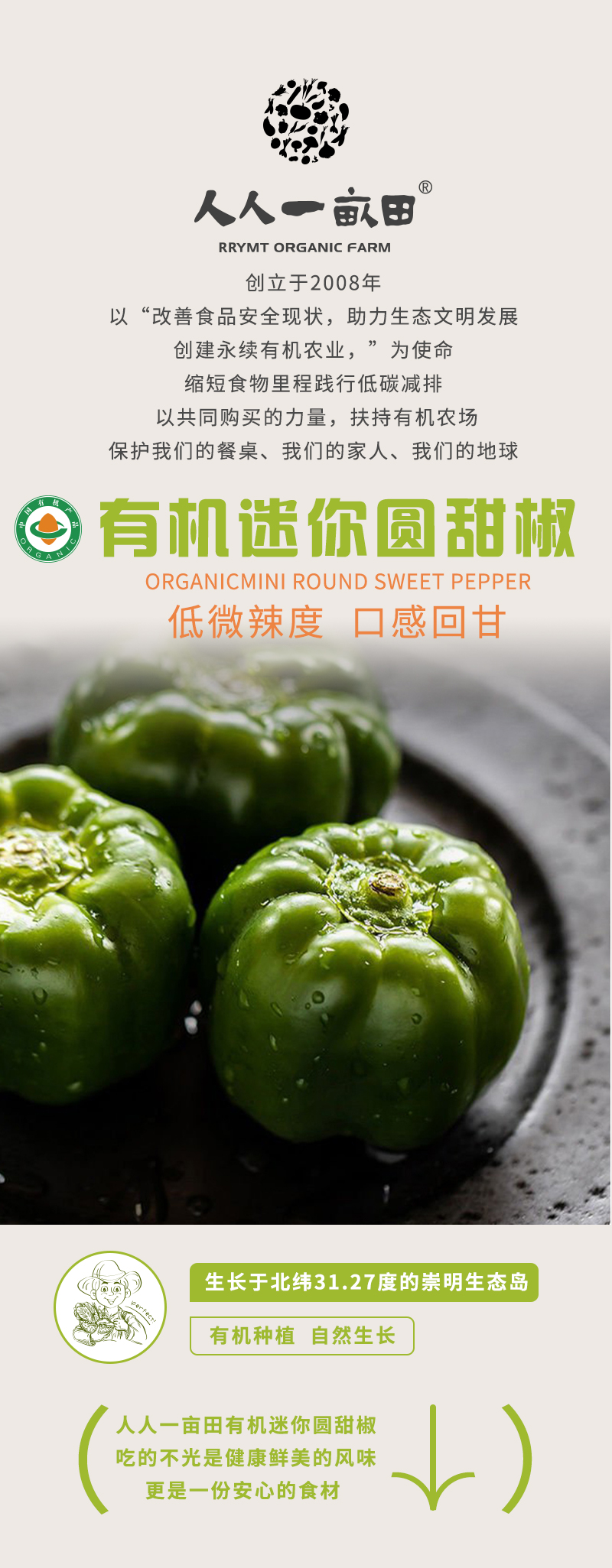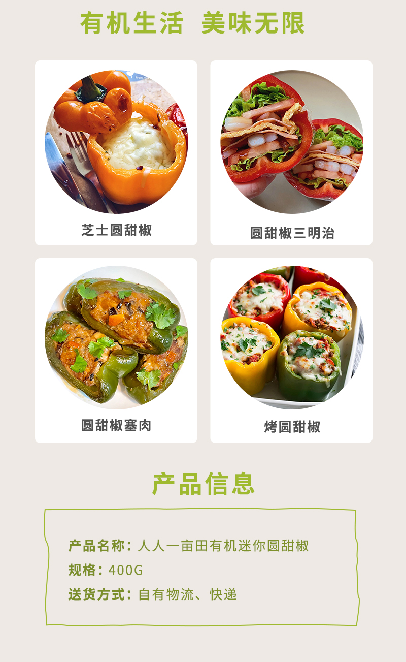 简介: 来自人人一亩田崇明农庄,专注种植,严格监测,冷链运输,快捷保鲜。甜椒又叫灯笼椒、柿子椒、菜椒等;可生食、炒食、煲汤、配菜等。