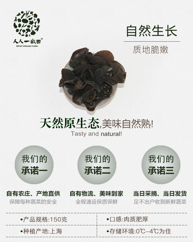 简介: 人人一亩田有机农庄多年来一直努力最大程度上杜绝农药、化肥、转基因种子、除草剂,种植蔬菜的过程更加符合环境保护,更多避免化学伤害。黑木耳营养又开胃的夏日爽口凉菜,色泽黑褐、柔软有弹性,风味可口,加醋凉拌老人小孩都爱吃!