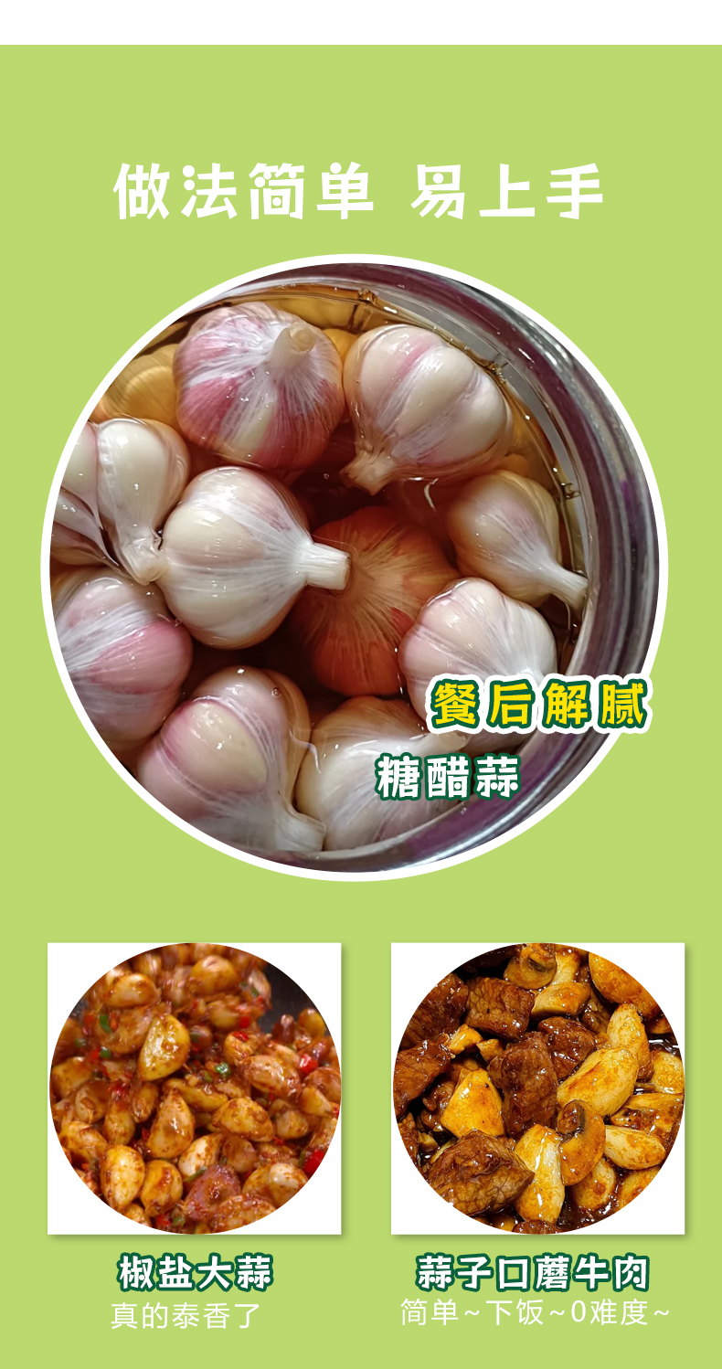 简介: 专注品质,匠心种植,产地现摘,新鲜到家。大蒜具有强大的杀菌能力,能消灭侵入体内的病菌。它还有助维生素B1的吸收,促进糖类的新陈代谢以产生能量。