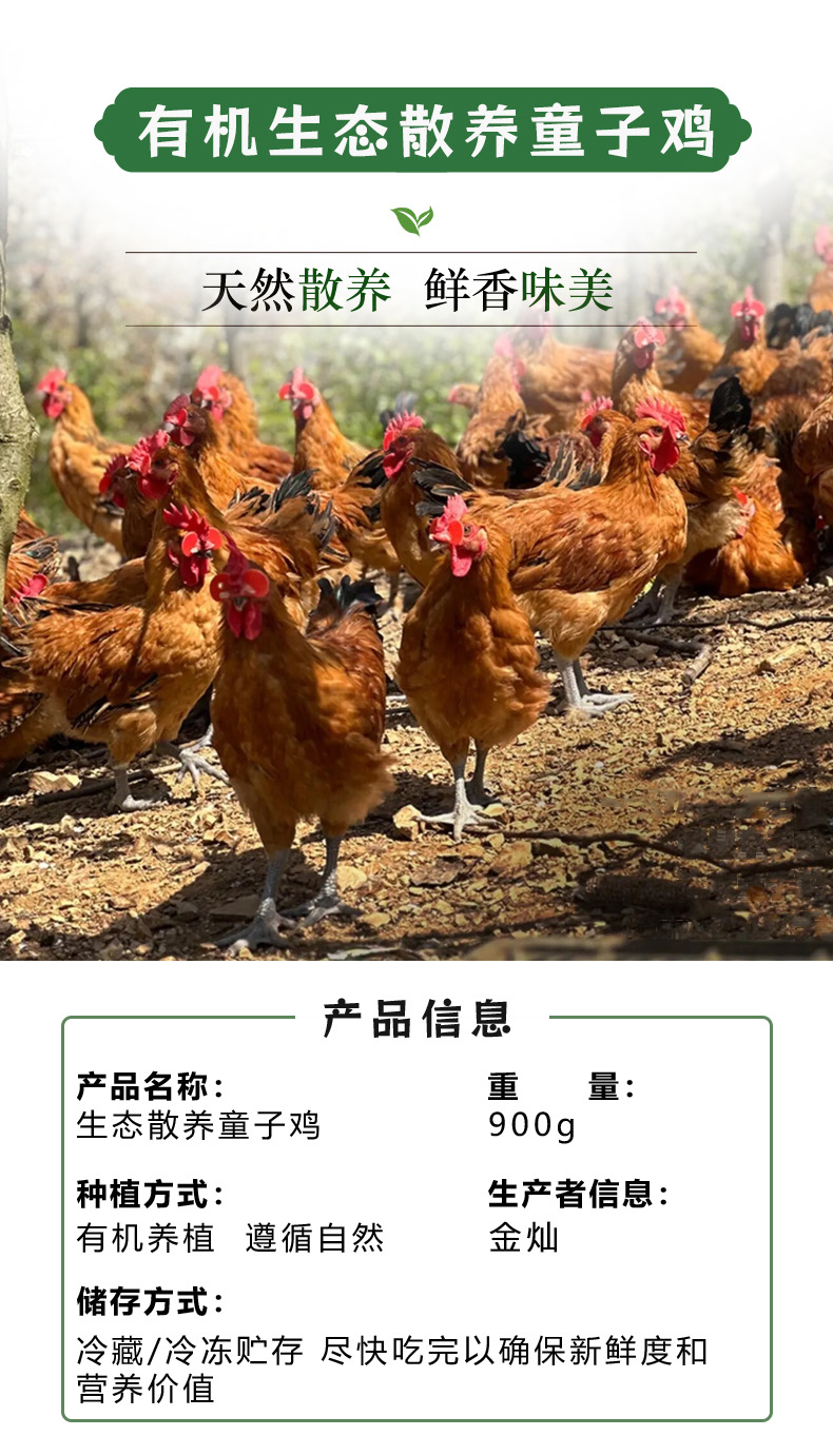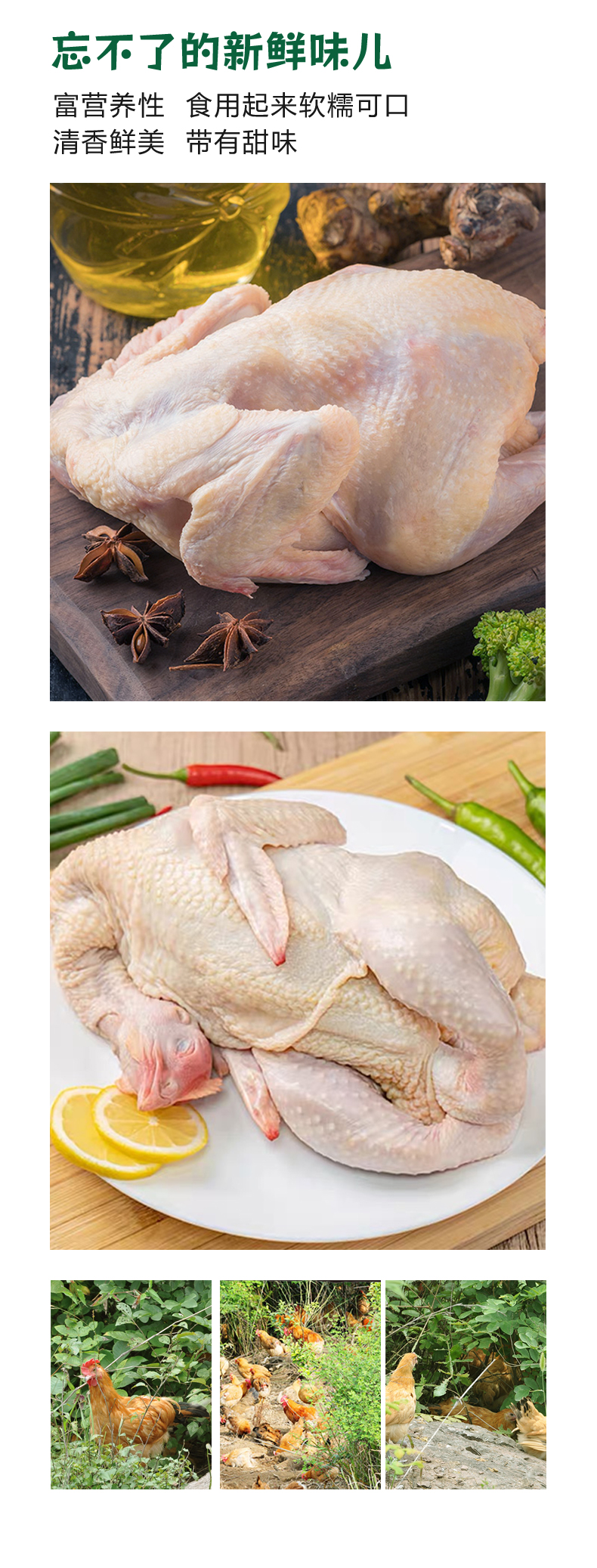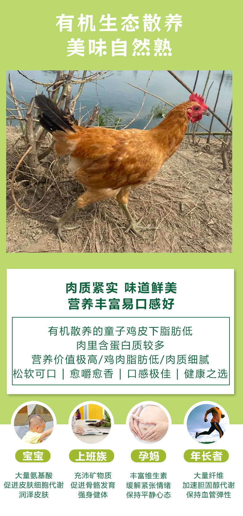 简介: 夏季换毛期,符合我们品质标准的数量有限,目前仅限认养客户点购,如有特殊需求,请联系您的营养顾问或私信客服,其中特别小的童子鸡因其肉质结实且鲜嫩,适合清蒸、清炒。在自然环境中自由长大,每亩地只允许70只鸡自由活动,有充分的呼吸和活动空间,科学规划饮食,肉质结实,胸肌健壮,脂肪较少~