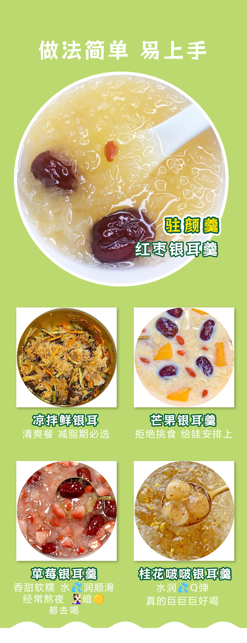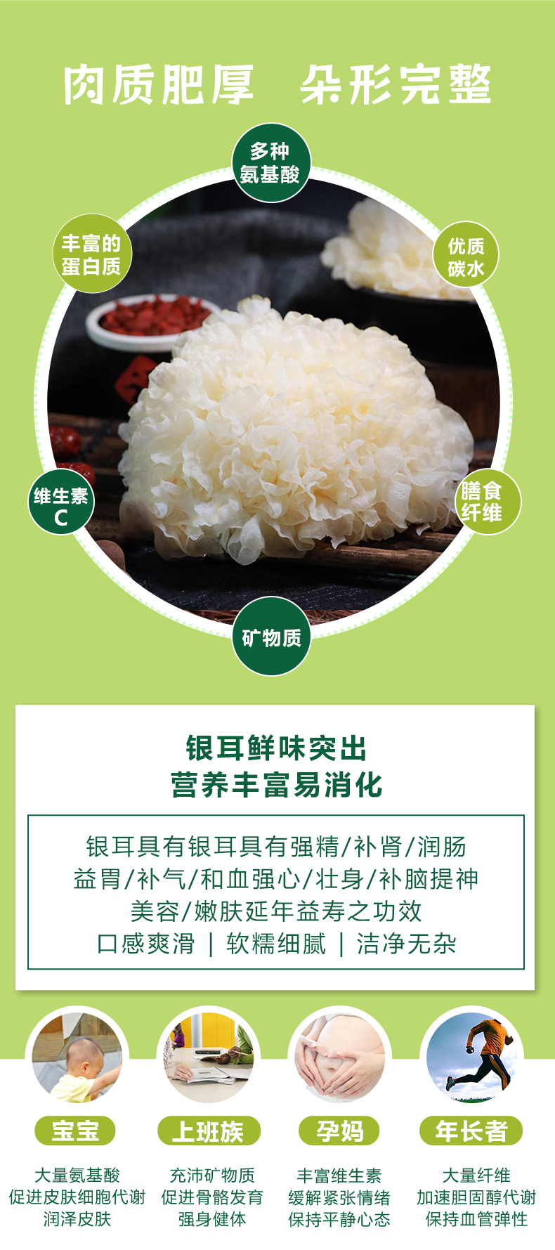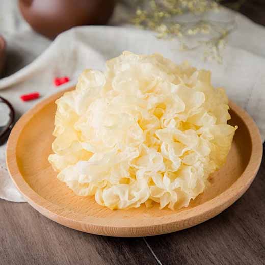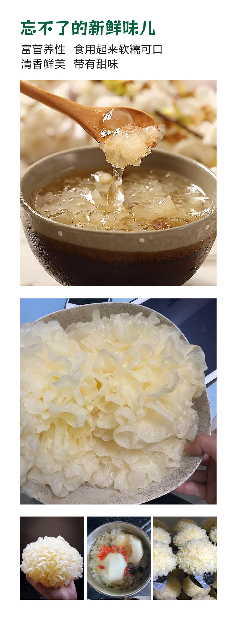 肉质肥厚,朵形完整,色泽雪白,口感糯滑。
