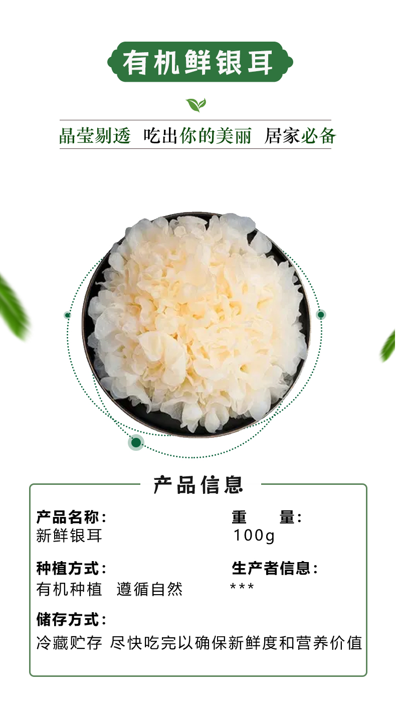 简介: 泉水灌溉,深山培育,口感好,营养高,可做凉菜、甜品、煲汤等。