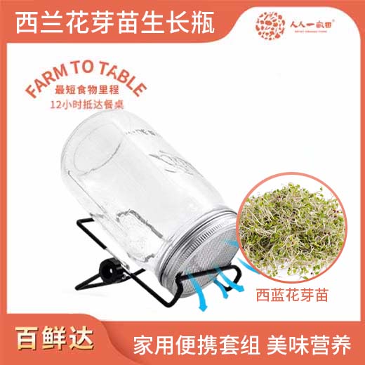 简介: 家用便携式西兰花芽苗菜玻璃发芽罐,操作简单方便,在家自己动手就能吃到好吃的芽苗菜,健康又营养。西兰花芽苗菜,含有丰富的维生素A、维生素C和胡萝卜素,丰富的泛酸,和一定量的类黄酮物质。此链接商品为:西兰花芽苗种子30g,玻璃瓶1个,不锈钢盖子1个,架子1个,底托1个。