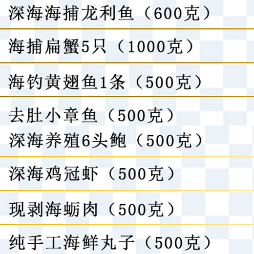 现捕现捞现发,订单确认后,预计3个工作日到达。(江浙沪包邮,其他地区快递费用另算。)内含:深海海捕龙利鱼(约600克),海捕扁蟹5只(约1000克),海钓黄翅鱼1条(约500克),去肚小章鱼(约500克),深海养殖6头鲍(约500克),深海鸡冠虾(约500克),现剥海蛎肉(约500克),纯手工海鲜丸子(约500克)。