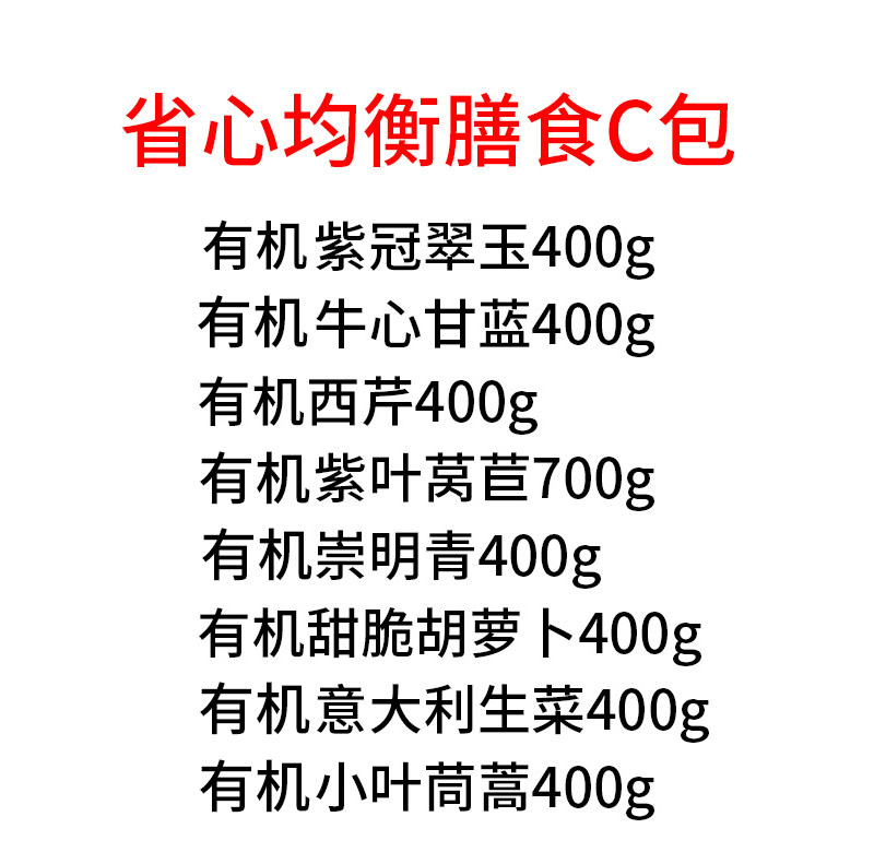 简介: 笑天推荐省心均衡蔬菜搭配包。科学搭配,一餐摄入多种蔬菜,每包精心组合当季鲜蔬,兼顾根茎、叶菜、菌菇等,颜色丰富、口感多样,不用再纠结“今天吃什么菜”。。此套餐包含:紫冠翠玉400g* 1 ,牛心甘蓝400g* 1 ,有机西芹400g* 1 ,紫叶莴苣700g* 1 ,崇明青400g* 1 ,有机甜脆胡萝卜400g* 1 ,意大利生菜400g* 1 ,小叶茼蒿400