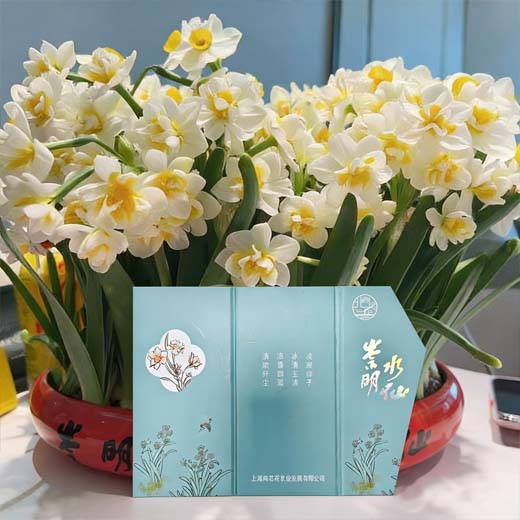 简介: 崇明水仙和漳州水仙齐名,它们同出一源,组成中国水仙两大品系。崇明水仙的特点是球根自然分株较少,且芳香浓郁,经月不散,为他地水仙所不及。花瓣润白似玉,状如圆盘,心呈金黄,宛如酒盏,故有“金盏银台”之美称。水仙在吐蕊绽放之际,那青翠欲滴的叶片,亭亭玉立的花梗,衬托着春雪般晶莹的花朵,阵阵芳馨沁人心脾,更给人以朴素几十年经验的老师傅每天都去帮他扶正雕刻。让它一直积极向上,这样它的花就会很漂亮,长大以后,就和花盆连为一体了,花长得很高的时候,它也不会倒伏,是一个非常好的一个艺术品,也象征了人生积极向上的